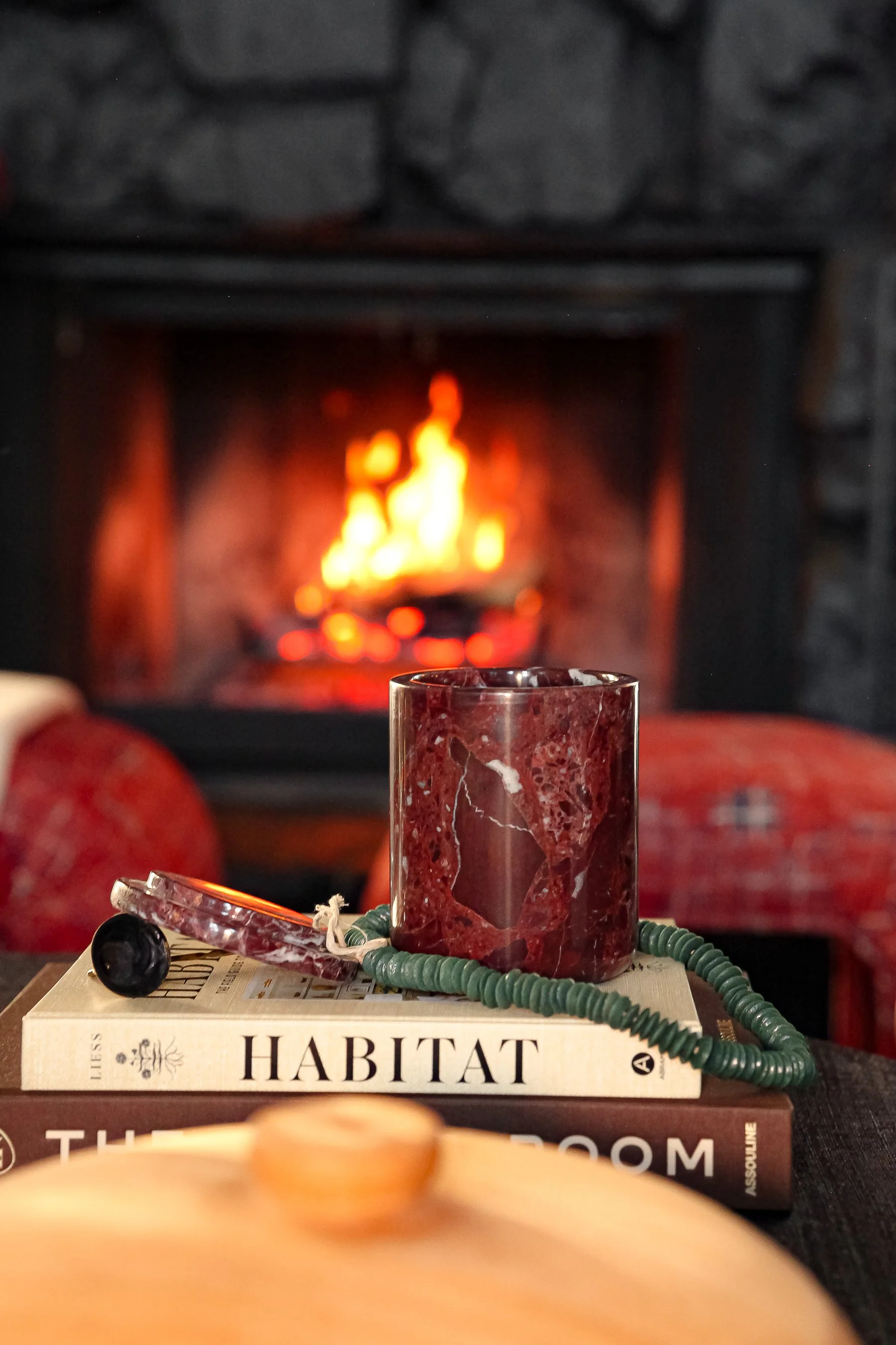 On the coffee table, I used a marble vessel created by my friend Alvin Wayne and repurposed it to hold a softly scented candle. Nothing new. Just intentional placement.