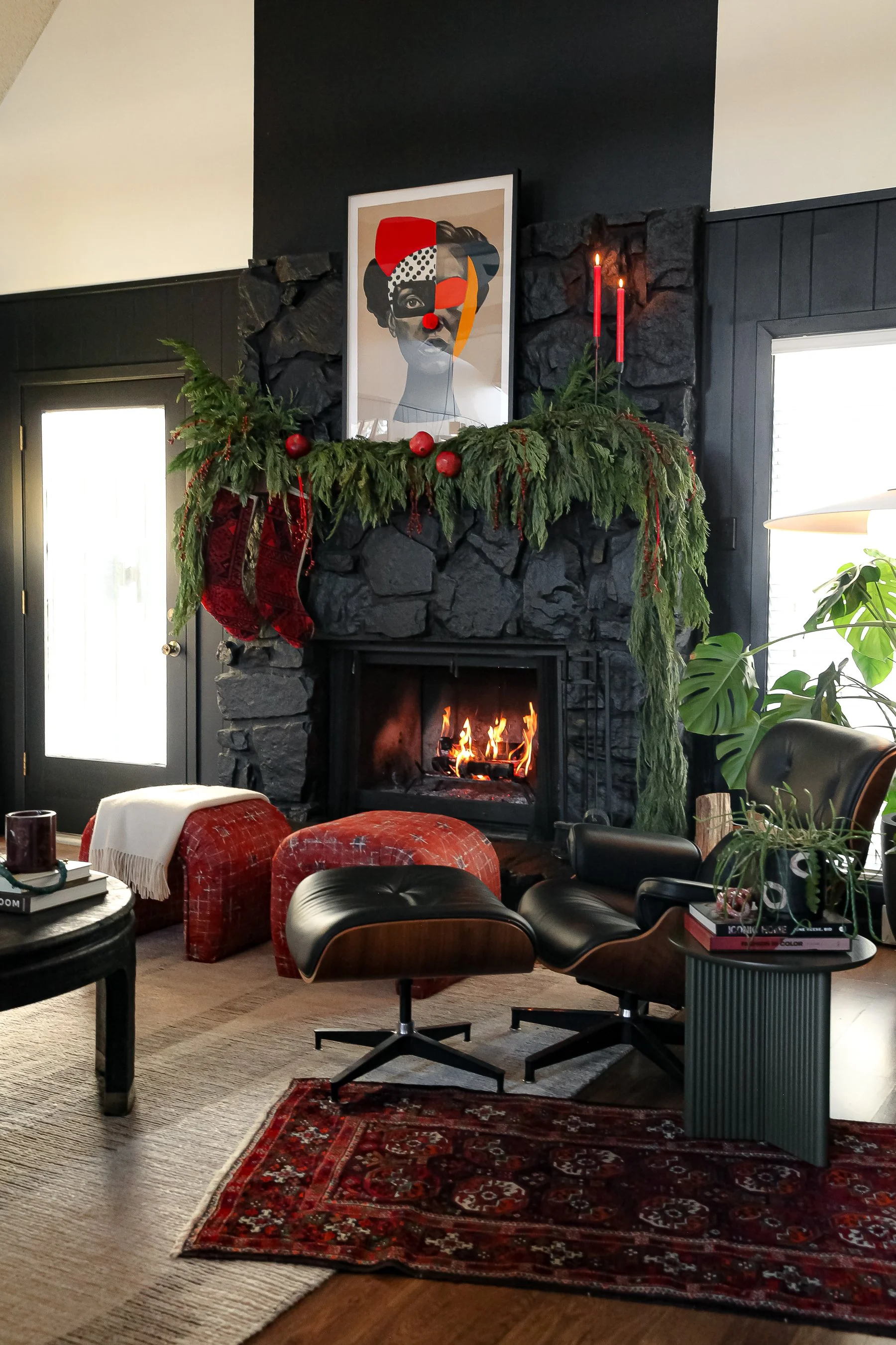 In the living room, that looked like pulling a vintage rug from the guest room closet and layering it under my Eames lounger and ottoman. It instantly made that corner feel warmer and more grounded.