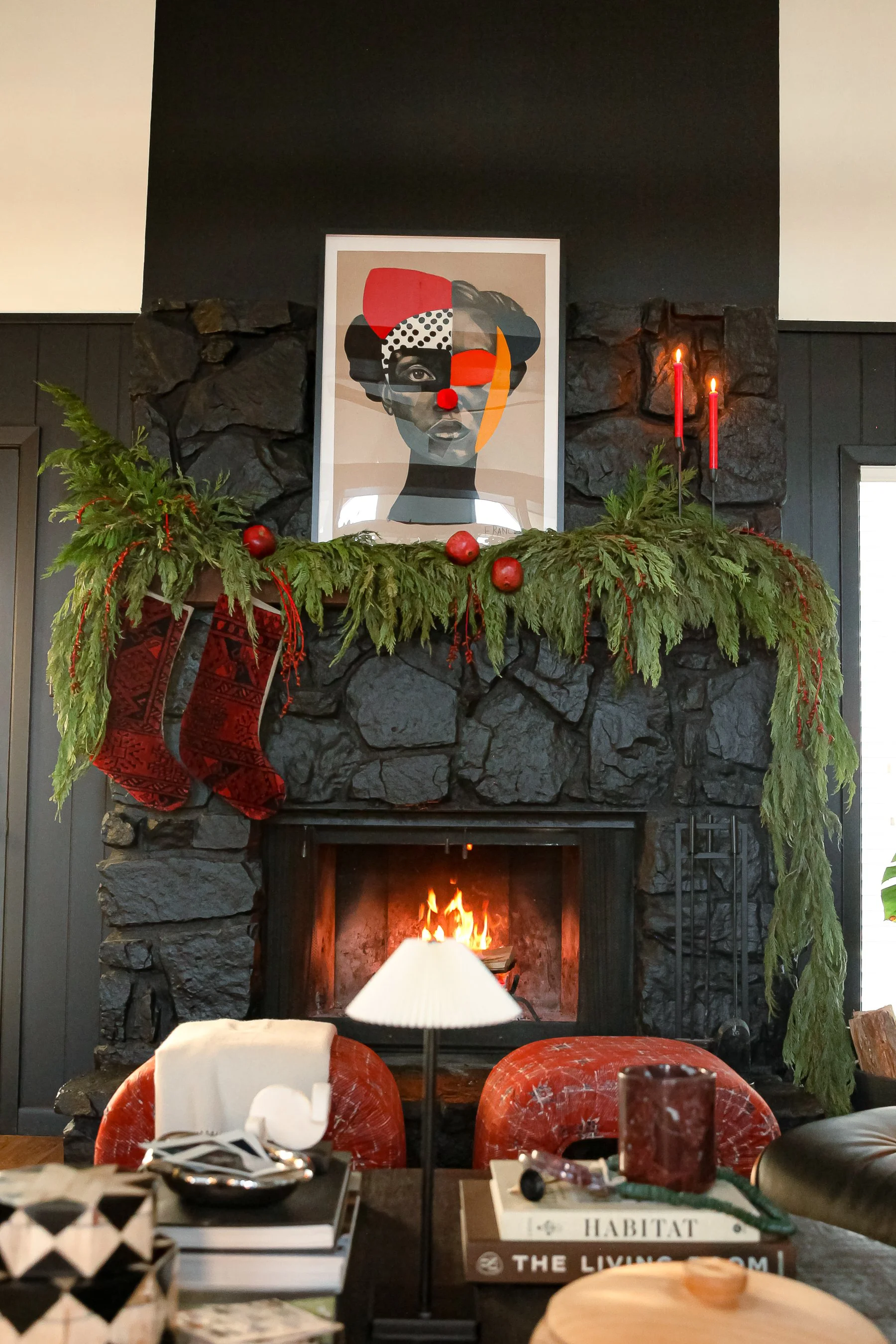 • A custom cedar garland made by floral artist Kristin, which brought the entire room to life (because that’s what plants do) with something for the senses: a fresh scent, visual texture, and added softness for that cozy feel.