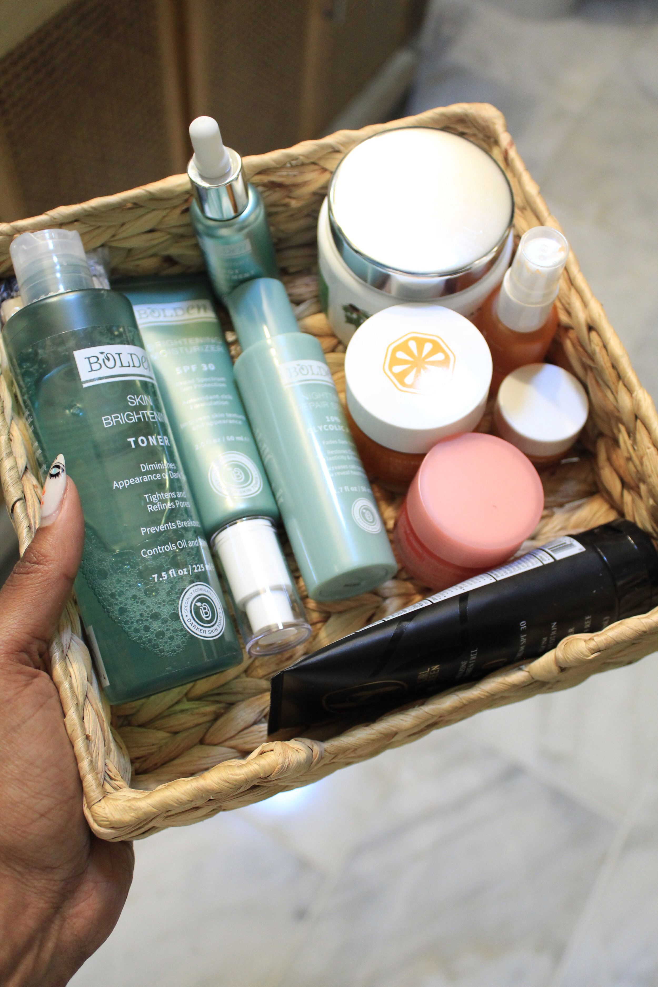 Now you may wonder, where do I keep all of this stuff!? Well, it’s all in a little napkin basket that I got from IKEA and I keep it inside our bathroom vanity. When it’s time to apply everything, I just pull out the entire basket, go through all of my steps and then return the basket back to inside the vanity. Everything’s all in one place, so I never miss a step!
