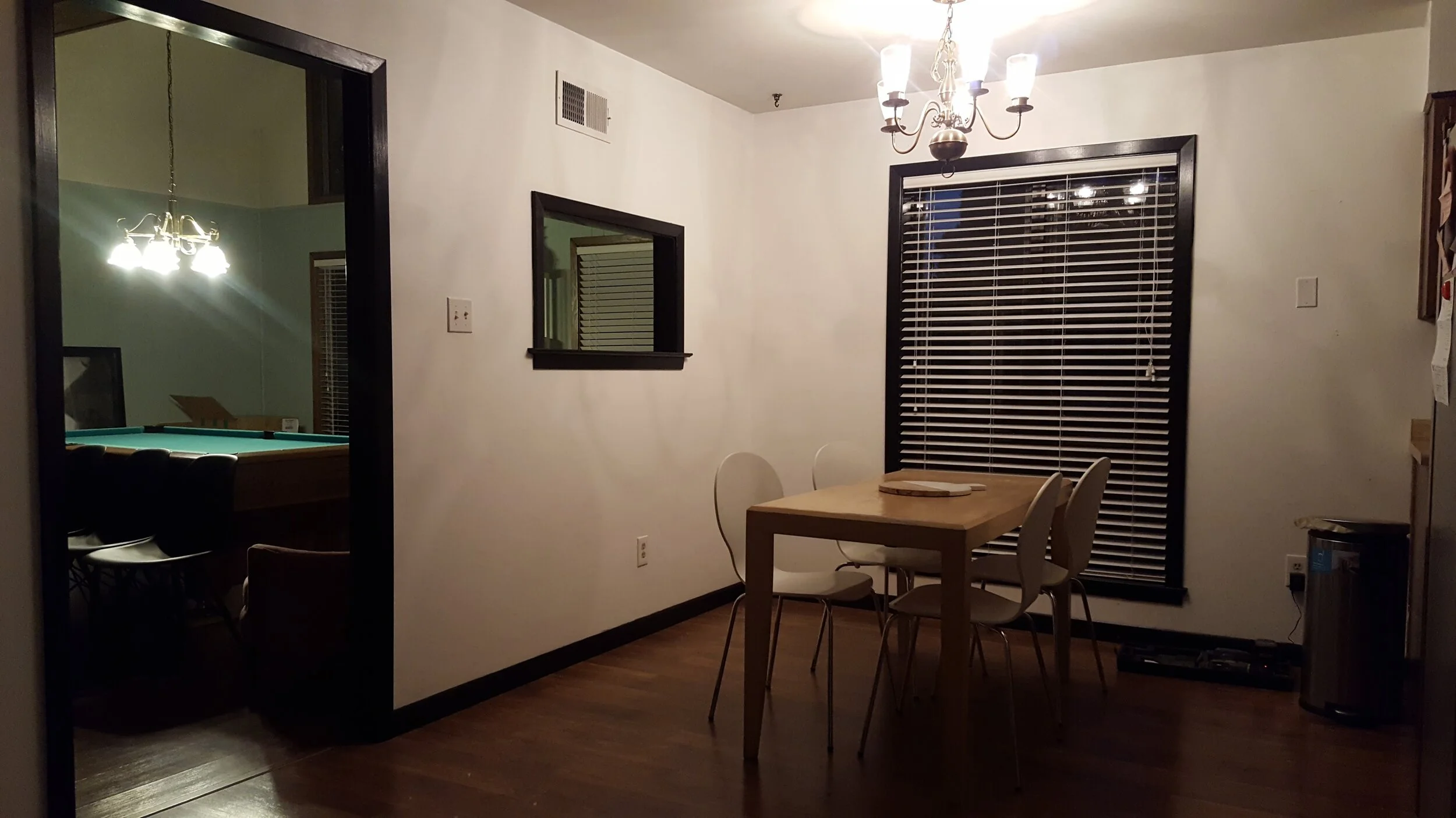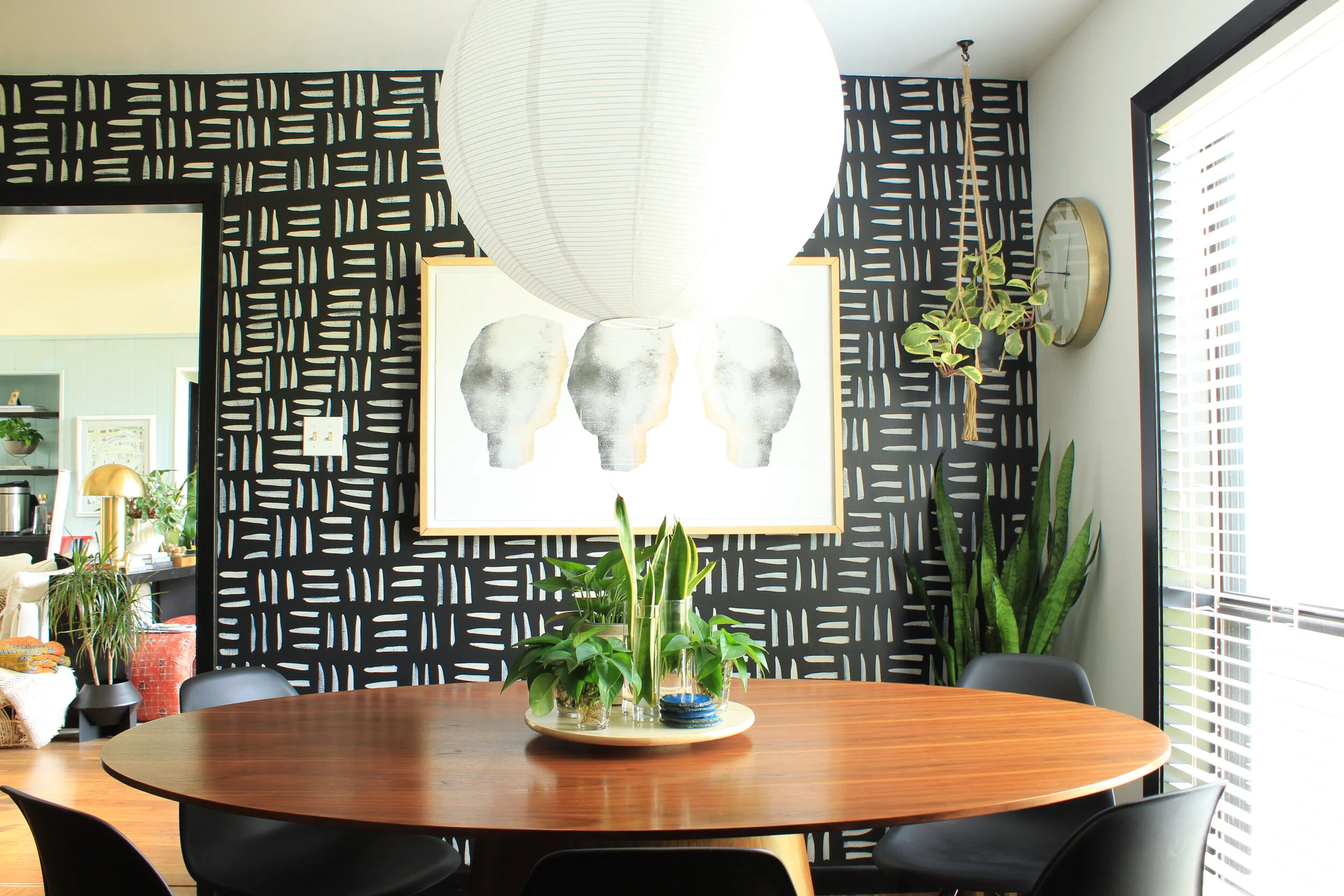 Eventually, we replaced the light fixture (twice), got a new dining table, played a few rounds of musical rugs and even covered the cut-out/pass-through with an oversized piece of art. Here’s a photo journey of how it transformed up until this past weekend.