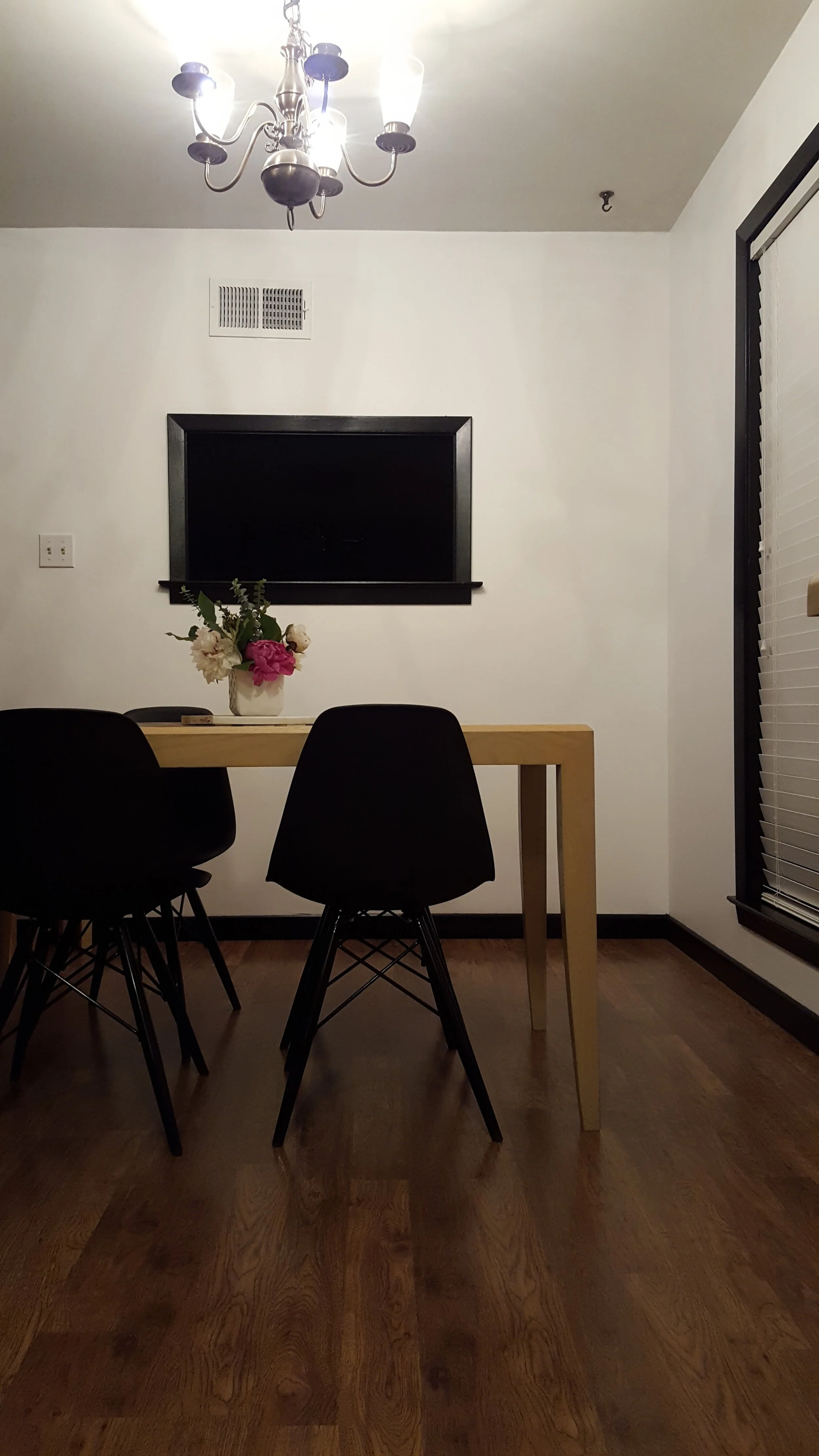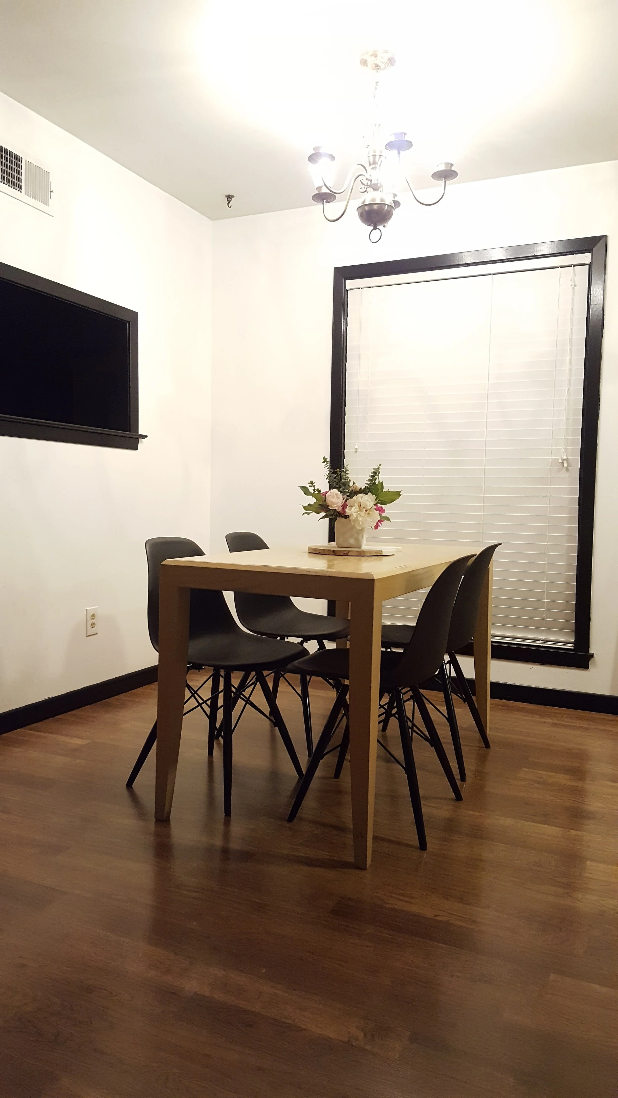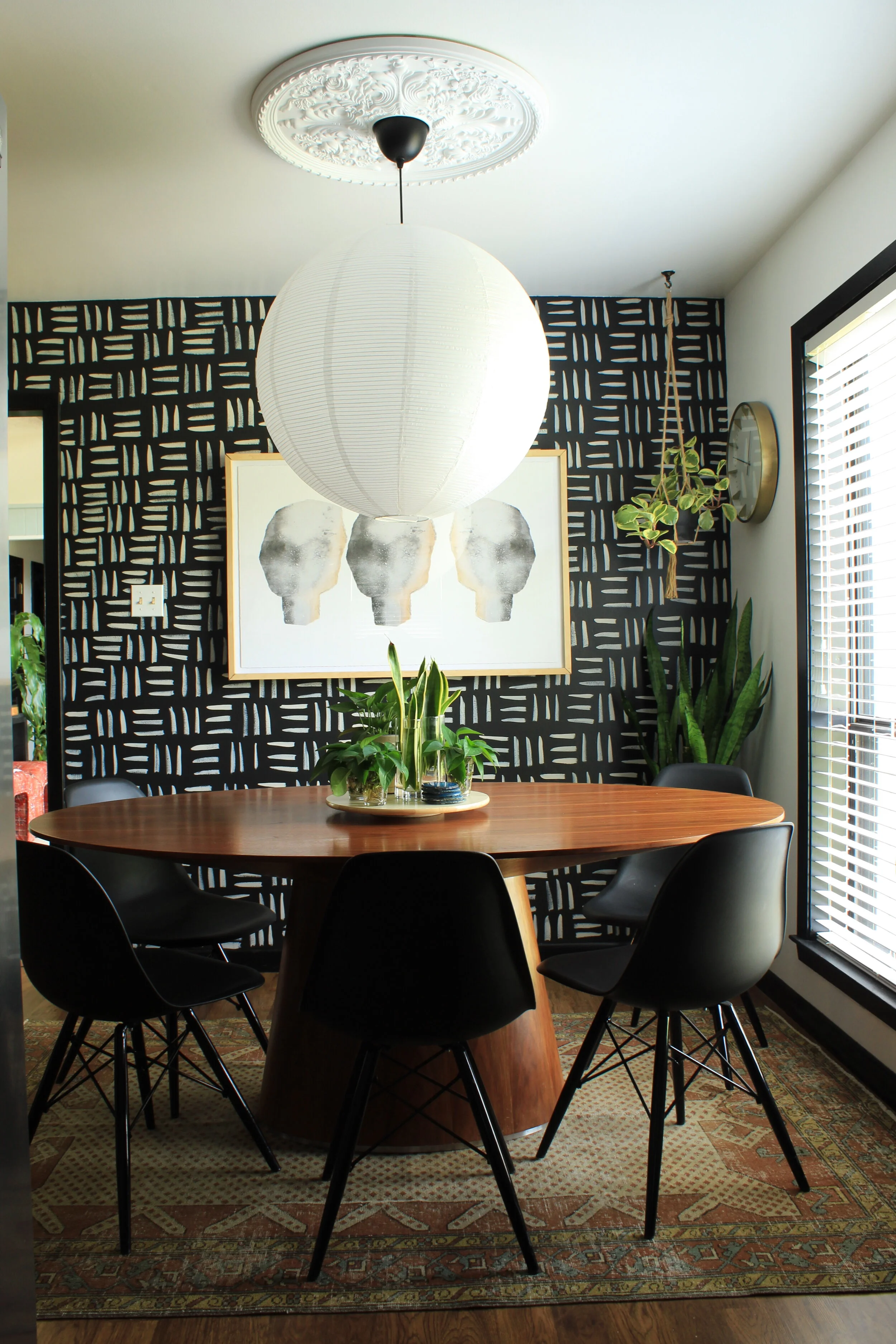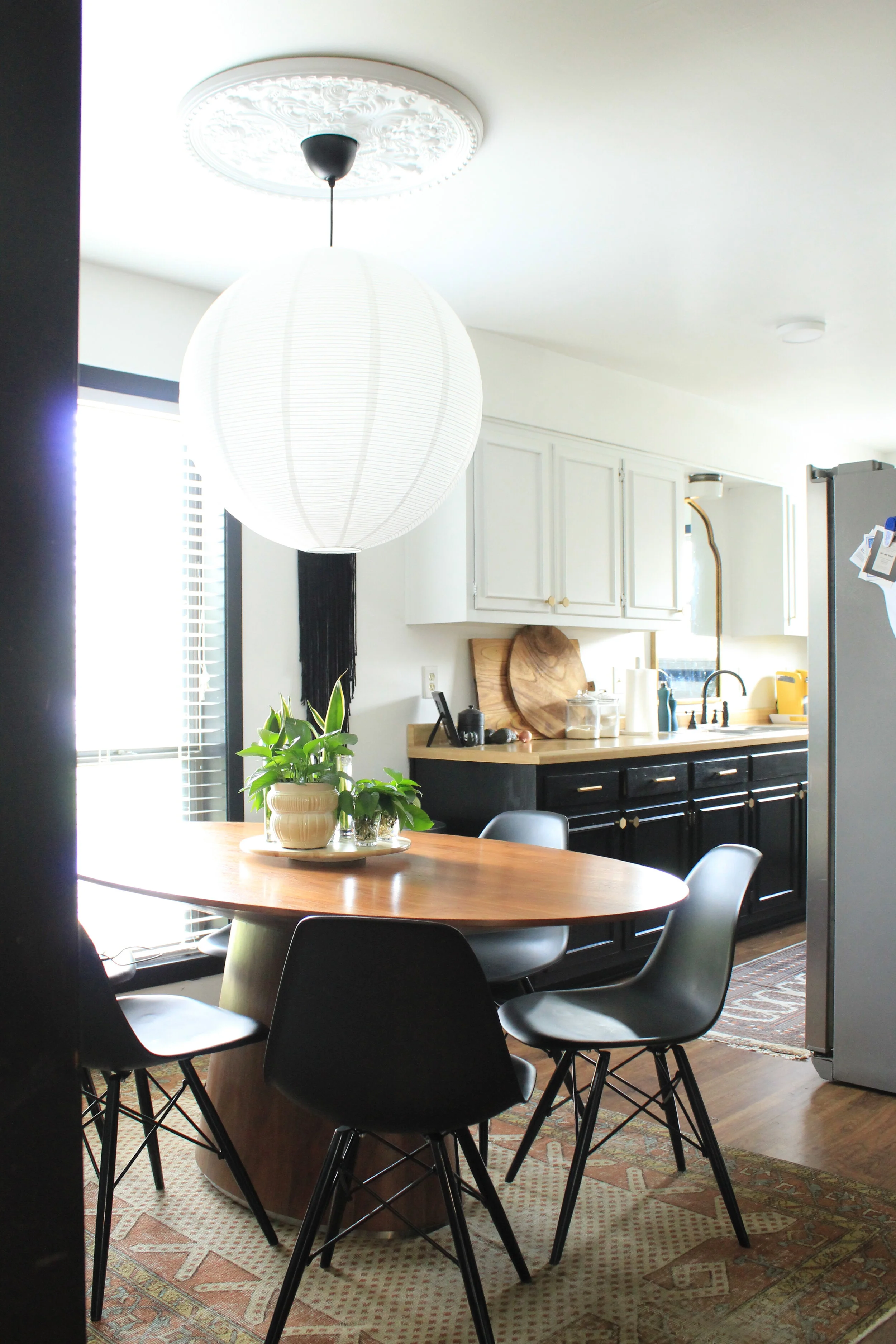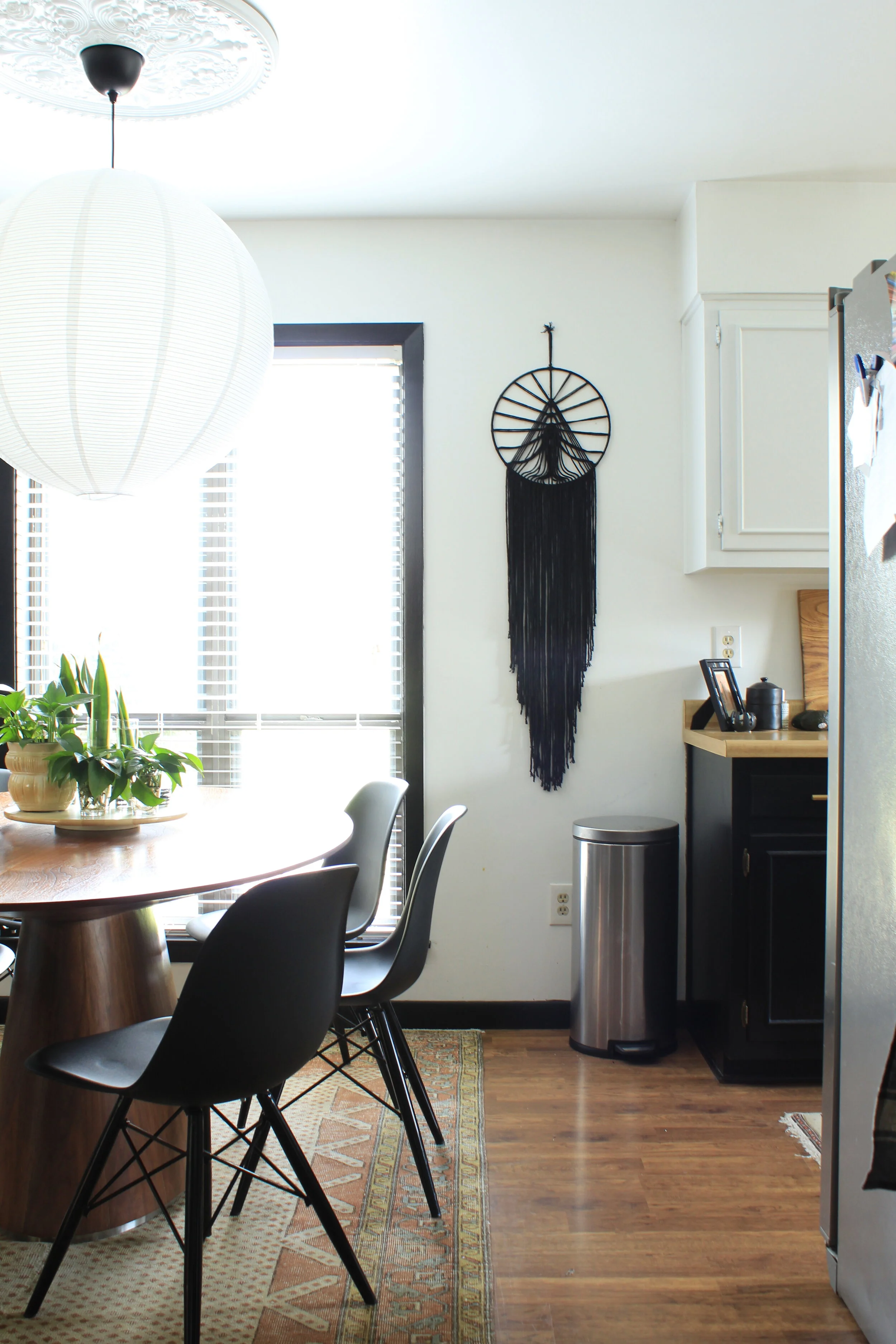 Above is what our dining space looked like right after we moved in. We just dropped in our tiny little table and Target chair into place. About a month after we moved in, I started the project of painting all of the trim and doors in our home black (Color: Glidden Paint Onyx). Here’s what the dining room looked like after the trim coat a few fresh coats.