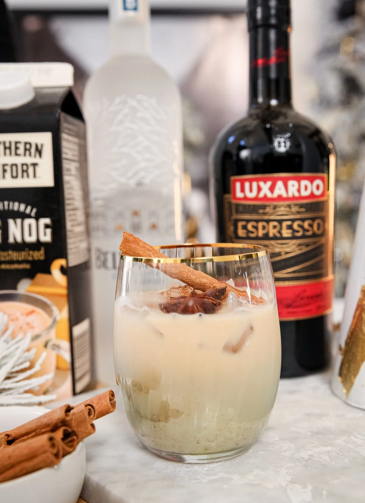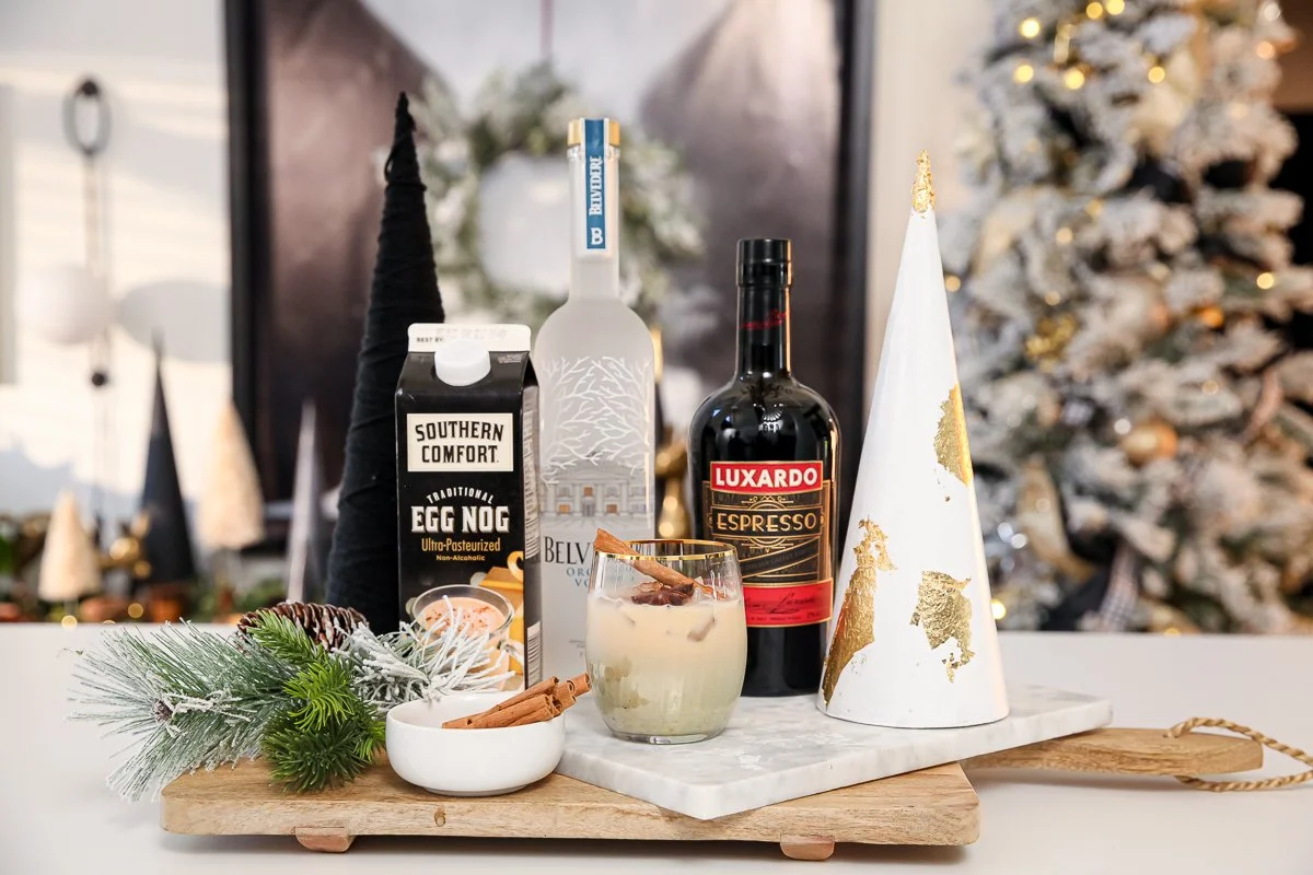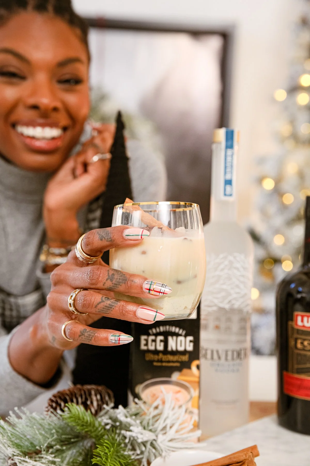 For Episode 5 of Crafts, Cocktails and Conversation with Carmeon Hamilton, we wanted to do a twist on a traditional White Russian and make it a little more apropos for holiday, so we added in Egg Nog to create a Silent Night! This cocktail is like a yummy adult milkshake, so keep it away from the kiddos!